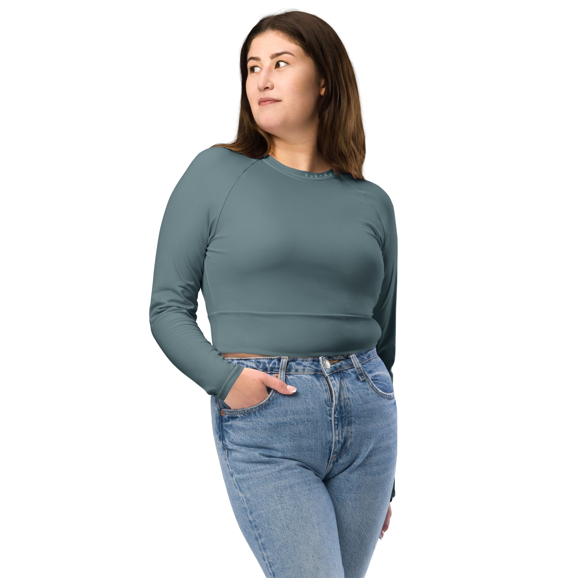 This long-sleeve crop top is made of recycled polyester and elastane, making it an eco-friendly choice for swimming, sports, or athleisure outfits. The crop top has a tear-away care label and a wide, double-layered waistline band for a comfortable fit.