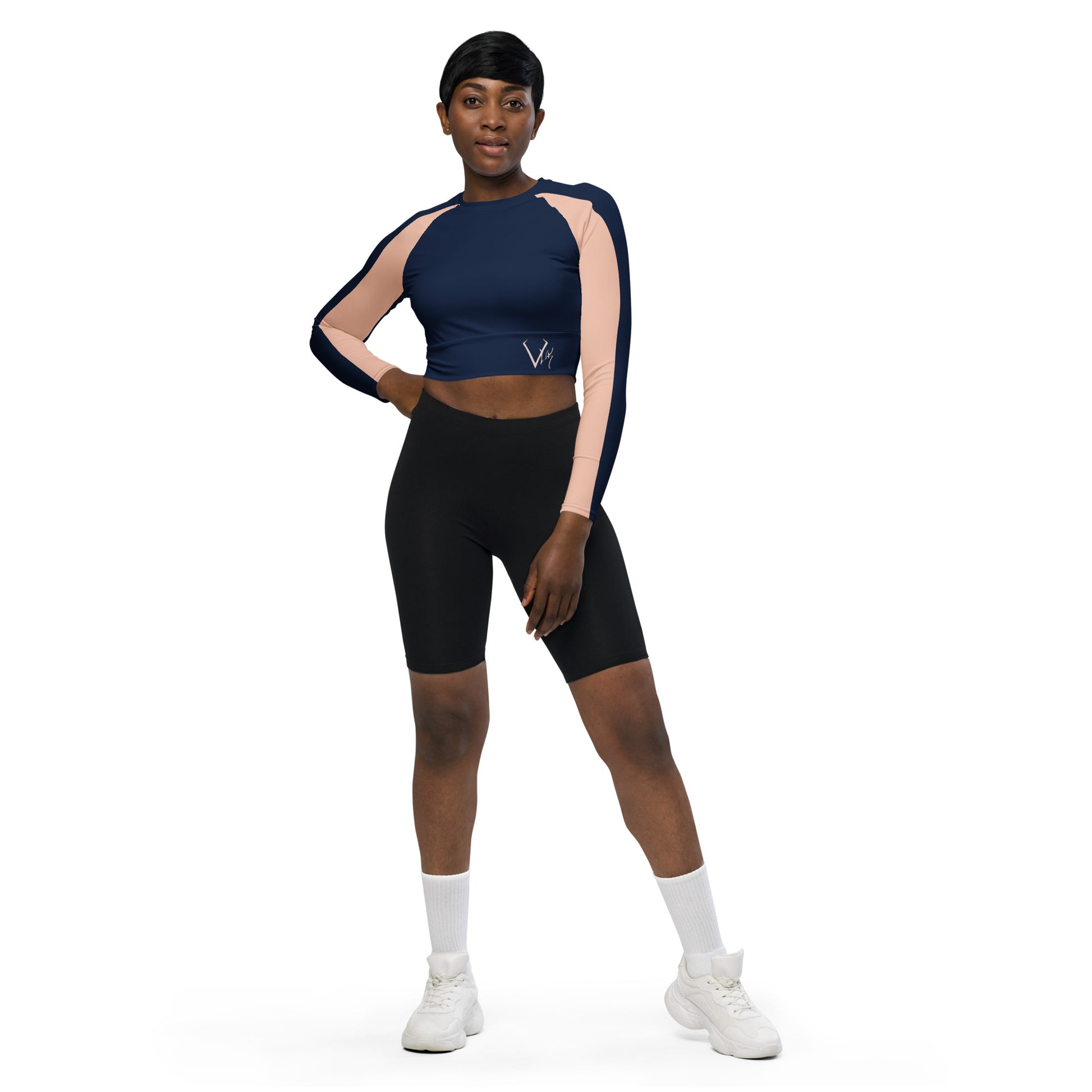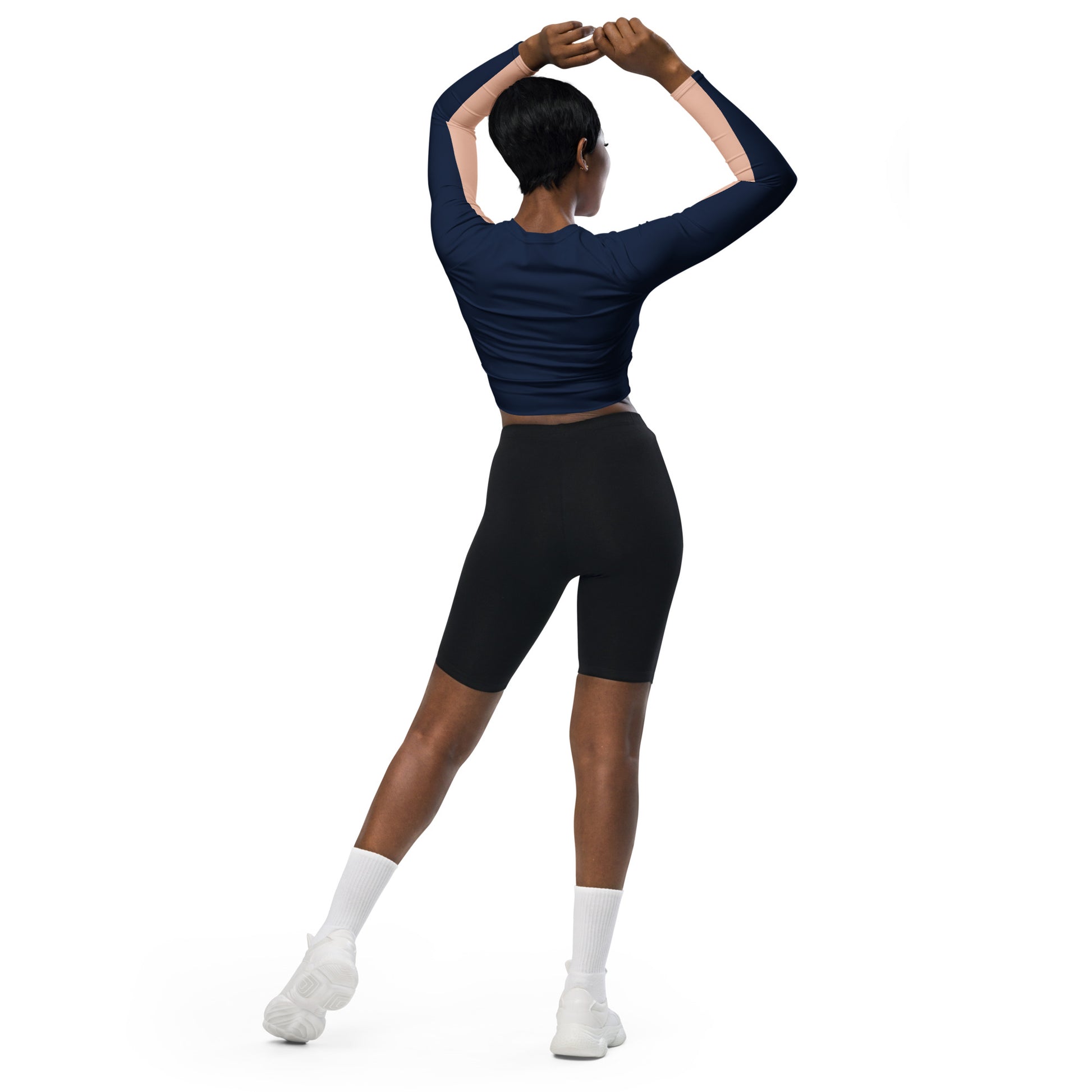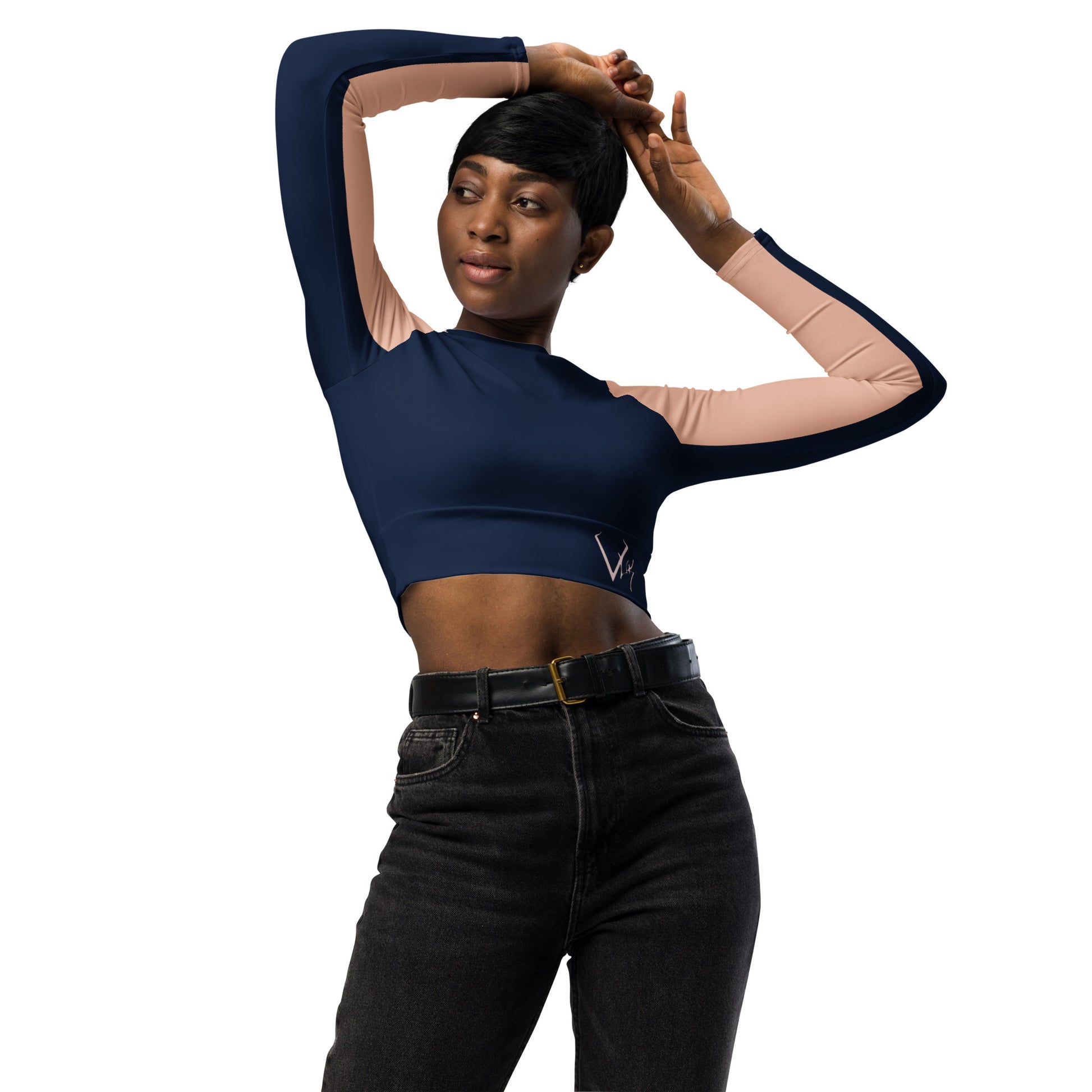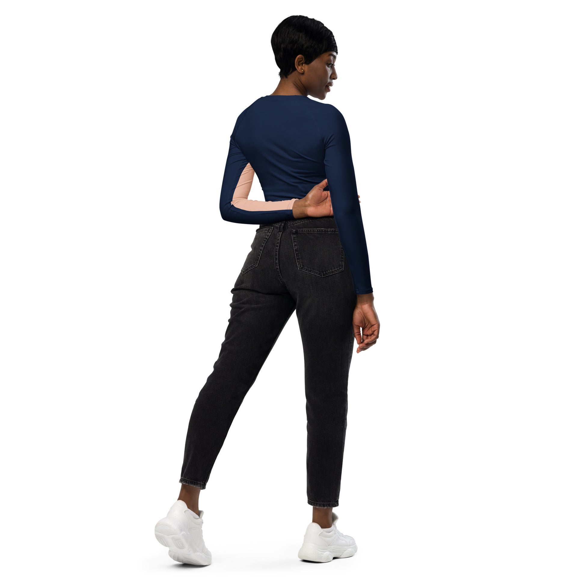 This long-sleeve crop top is made of recycled polyester and elastane, making it an eco-friendly choice for swimming, sports, or athleisure outfits. The crop top has a tear-away care label and a wide, double-layered waistline band for a comfortable fit.
