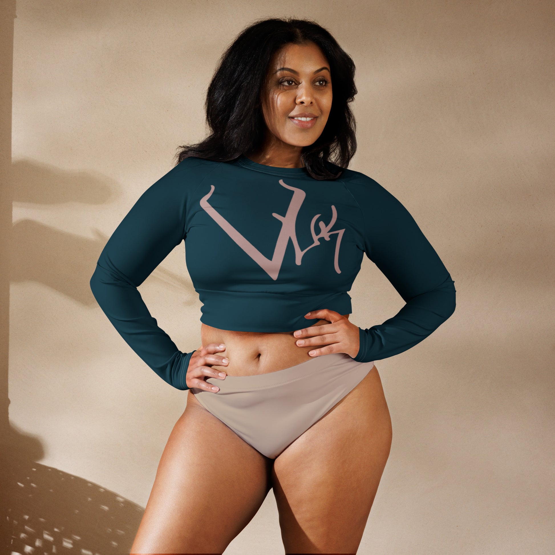 This long-sleeve crop top is made of recycled polyester and elastane, making it an eco-friendly choice for swimming, sports, or athleisure outfits. The crop top has a tear-away care label and a wide, double-layered waistline band for a comfortable fit.